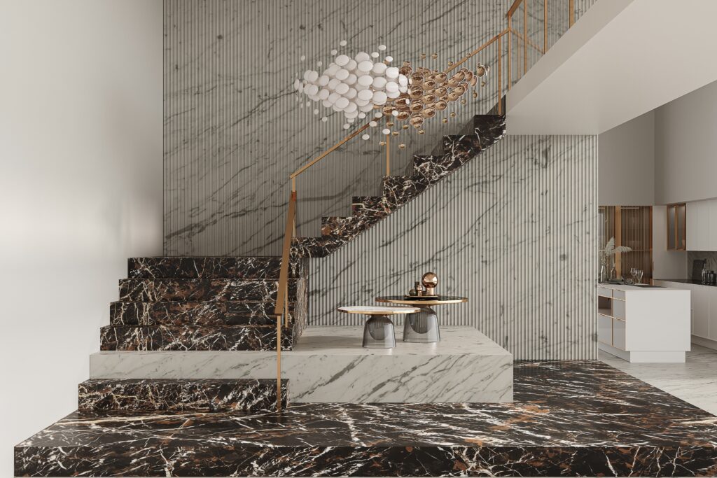 A sophisticated interior design demonstrating how different marble finishes can be combined effectively. The contrast between polished white Statuario marble and dramatic dark marble creates visual depth and architectural interest, showcasing the versatility of marble finishes in luxury spaces.